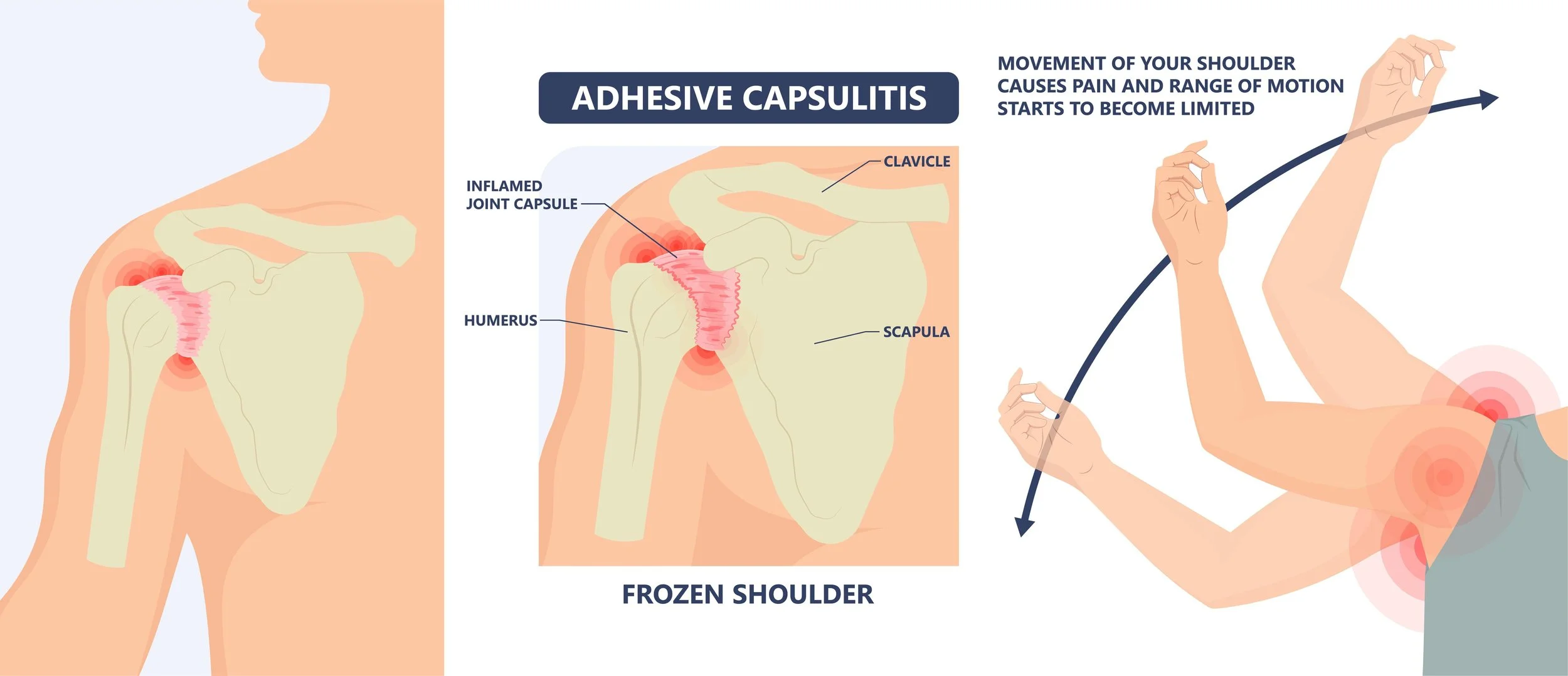 Frozen Stage: Pain can start to reduce in this stage; however, the shoulder is very stiff, and movement is very difficult.